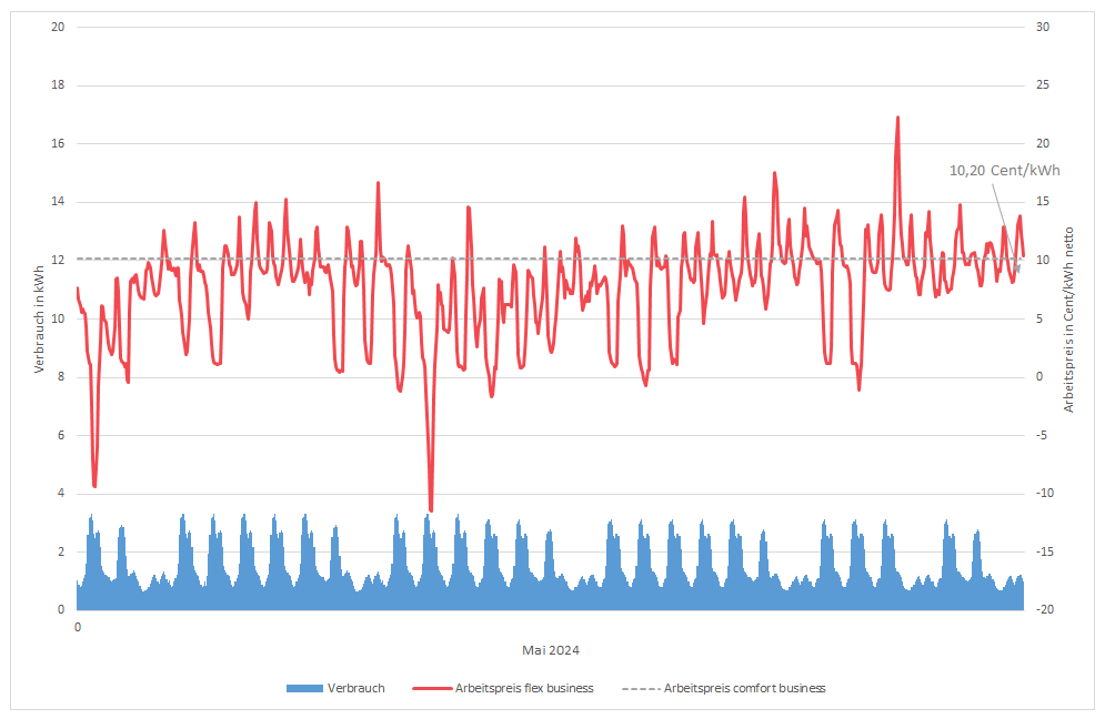 Der Preis für den Monat Mai 2024 für das Produkt flex business wird auf Basis des Standardlastprofils G0 vom Mai 2024 berechnet. Dabei werden die viertelstündlichen Verbräuche multipliziert mit dem viertelstündlichen Preis der EPEX Spot AT plus Aufschlag.