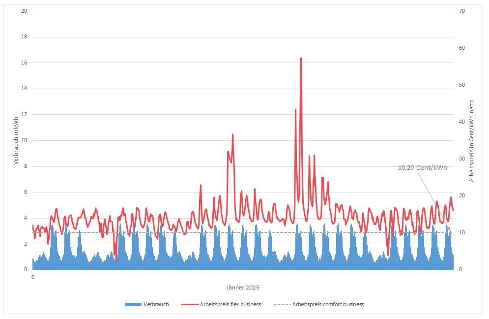 Der Preis für den Monat Jänner 2025 für das Produkt flex business wird auf Basis des Standardlastprofils G0 vom Jänner 2025 berechnet. Dabei werden die viertelstündlichen Verbräuche multipliziert mit dem viertelstündlichen Preis der EPEX Spot AT plus Aufschlag.