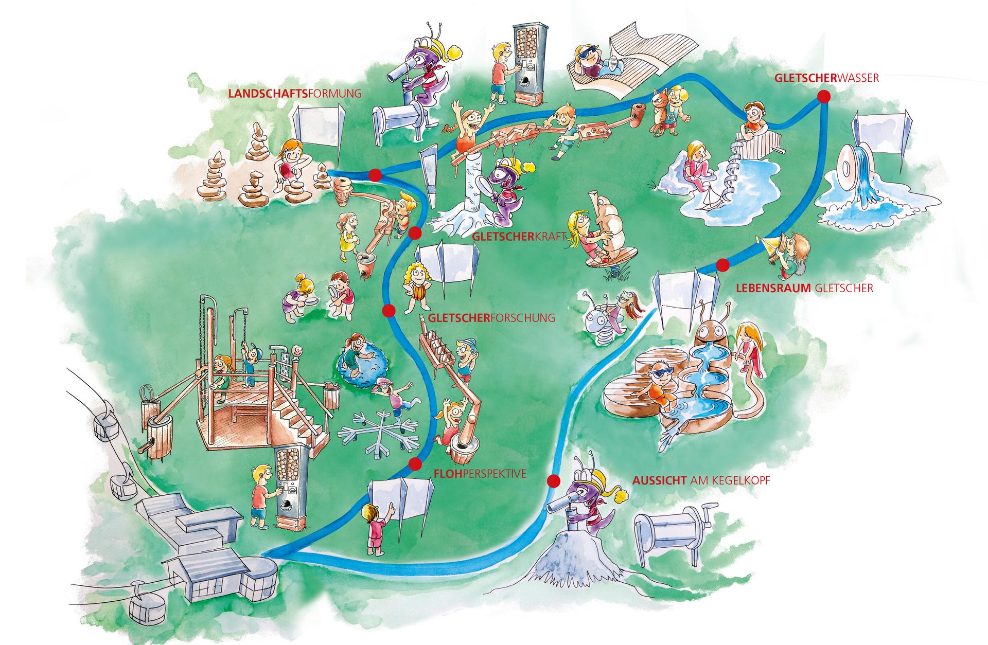 Schon von weitem sieht man den "Schwebenden Wasserhahn", der zugleich Start- und Zielpunkt der Wanderung ist. Wieviel Wasser braucht der Mensch? Was sind Thermalquellen? Diese Fragen werden entlang des Weges beantwortet und gemeinsam mit Gletscherfloh Luis entdecken Klein und Groß Stationen, die über die Kraft des Wassers und die Wandelfähigkeit des lebensnotwendigen Naturelements berichten. Mut und eine gehörige Portion Geschicklichkeit benötigt man bei der großen Wasserfallschaukel und dem Zielschießen mit Wasserpumpen!