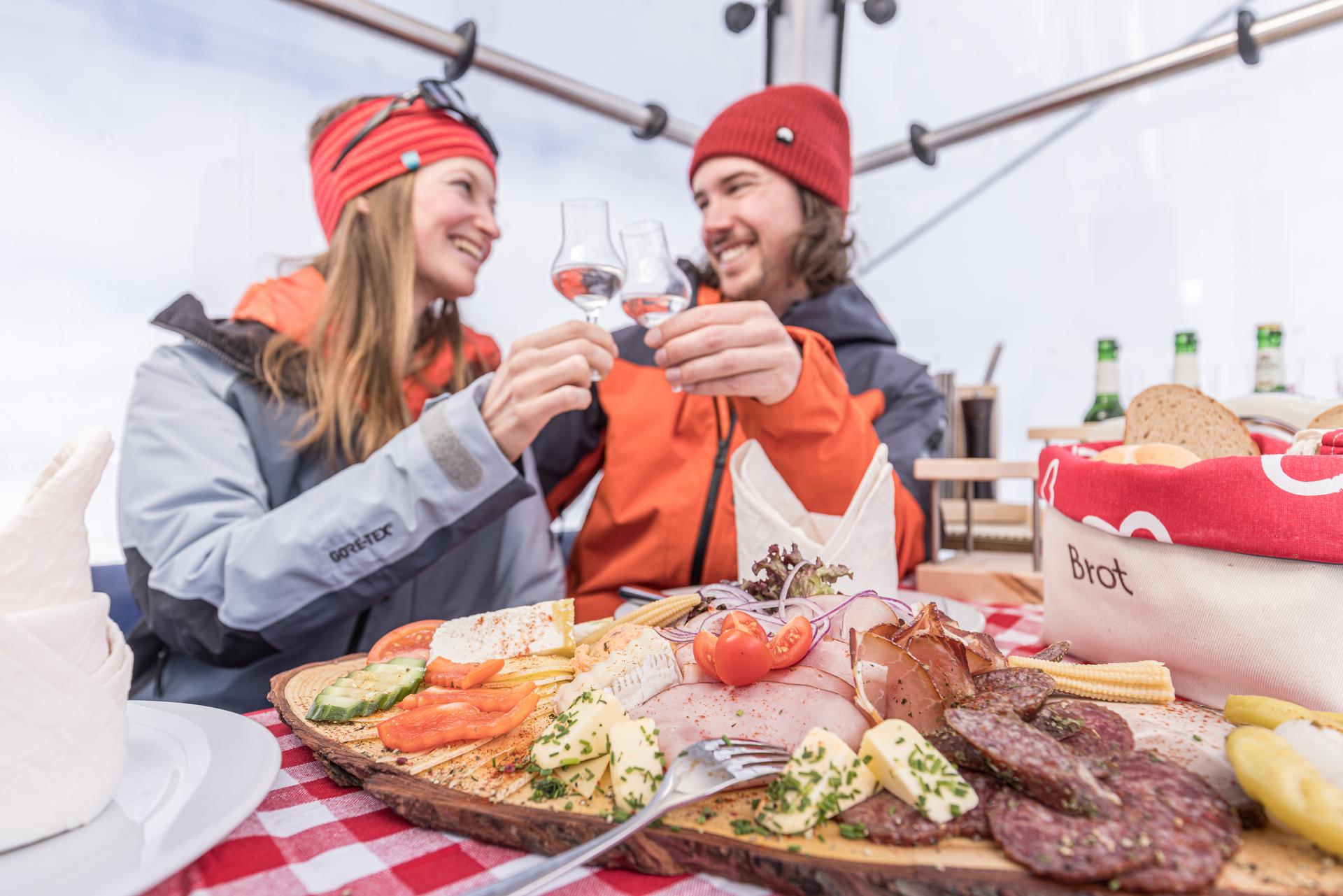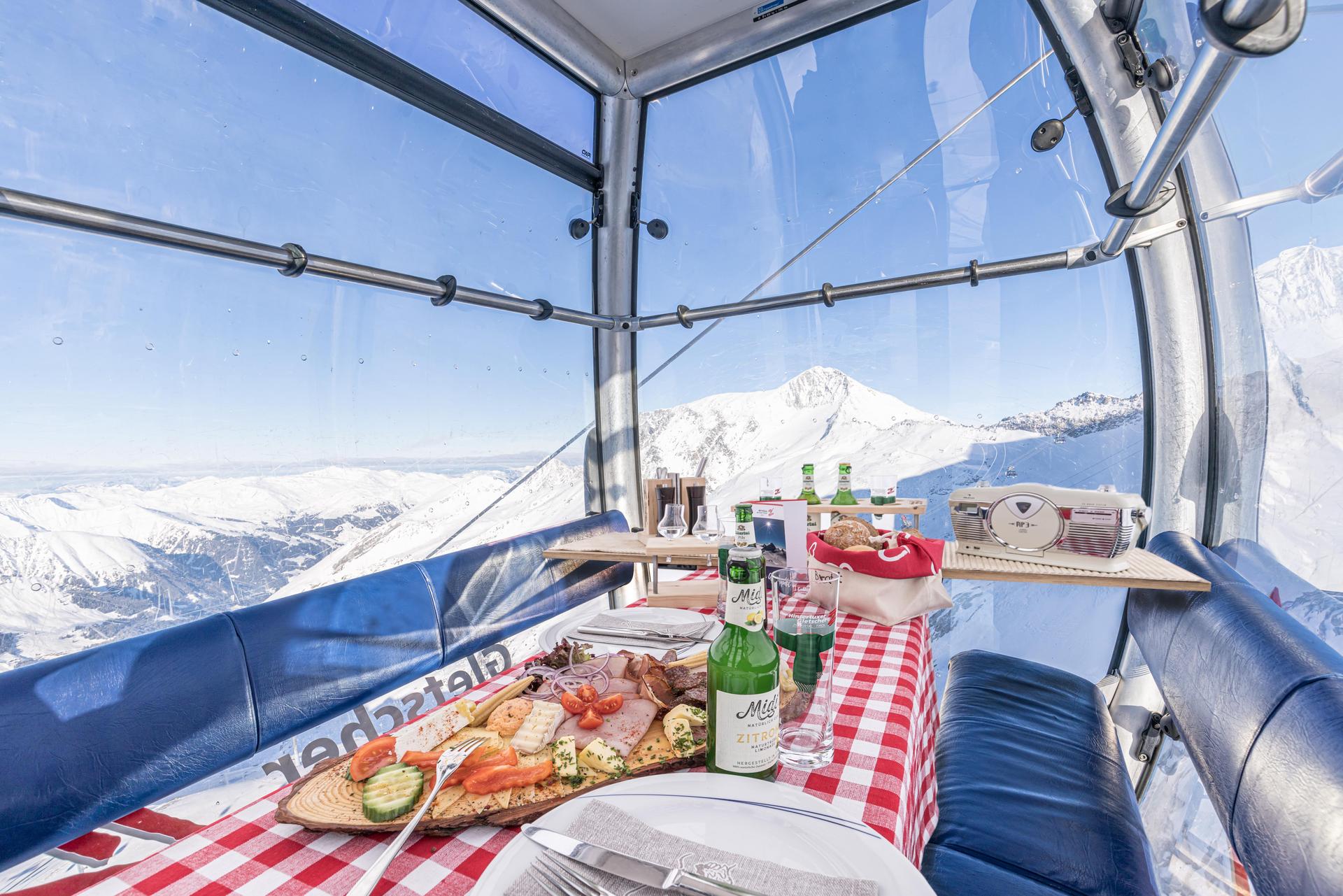 The Brettljause in the gondola can either be made with the regular ski pass or as a pedestrian with the "Panoramic ticket Fascination Ice". The Panoramic ticket Fascination Ice is also valid for the Gletscherbus 3, so feel free to go to the top to the Panorama Terrace or to the Nature's Ice Palace before your reservation.
