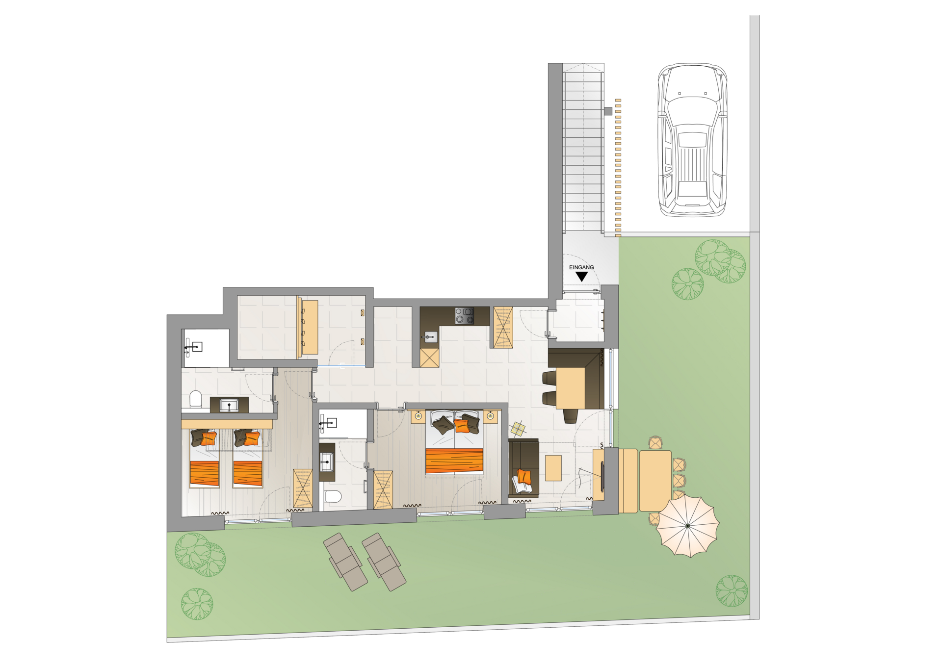 A light-flooded, cosy home with a stylish interior awaits you. The spacious apartment offers two separate bedrooms, each with its own bathroom for maximum comfort and privacy. Wonderfully comfortable, allergy-friendly beds provide the relaxation you long for. The bright dining room with its cosy corner bench is the perfect place to enjoy the creations conjured up in the well-equipped kitchen. A private terrace overlooking the garden and the breathtaking view of the surrounding mountains round off the feel-good offer. In the apartment you will also find: