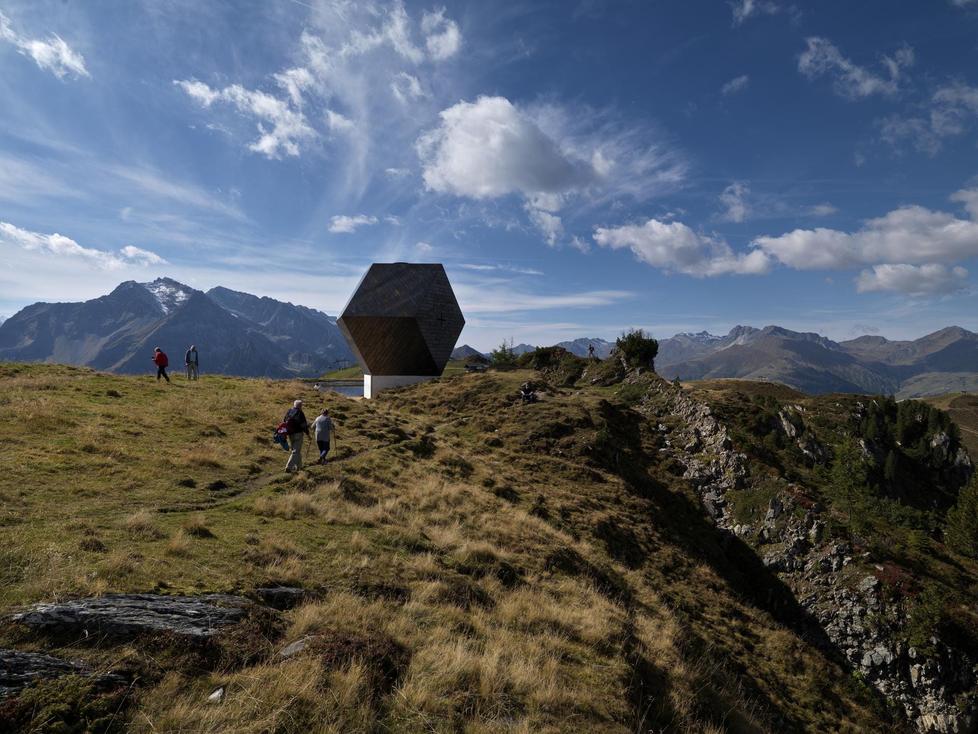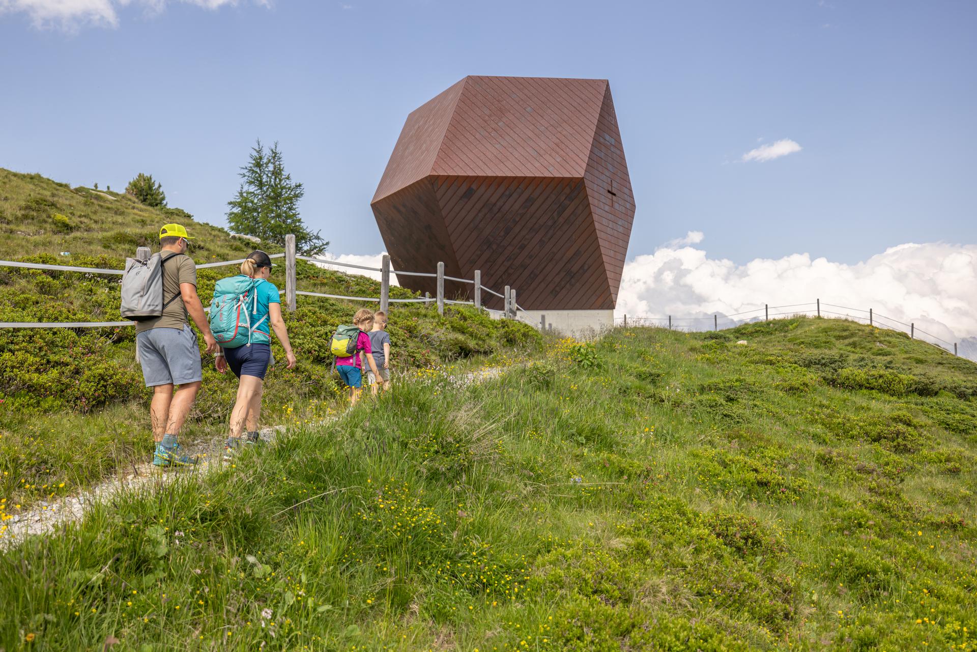 The idea was to base the shape on that of the natural garnet and to make it the theme of this chapel. This was realised using the materials steel and wood. The strict mathematically reproducible geometry of this structure is supposed to represent the strict contrast between the rationality of people and free organic nature. Such a pure shape, this kind of gemstone at the top of a mountain, is also an opportunity to illustrate the connection between heaven and earth. The structure is connected to the earth‘s crust by gravity but it is surrounded by the endlessness of the universe and the beautiful nature of the Zillertal.