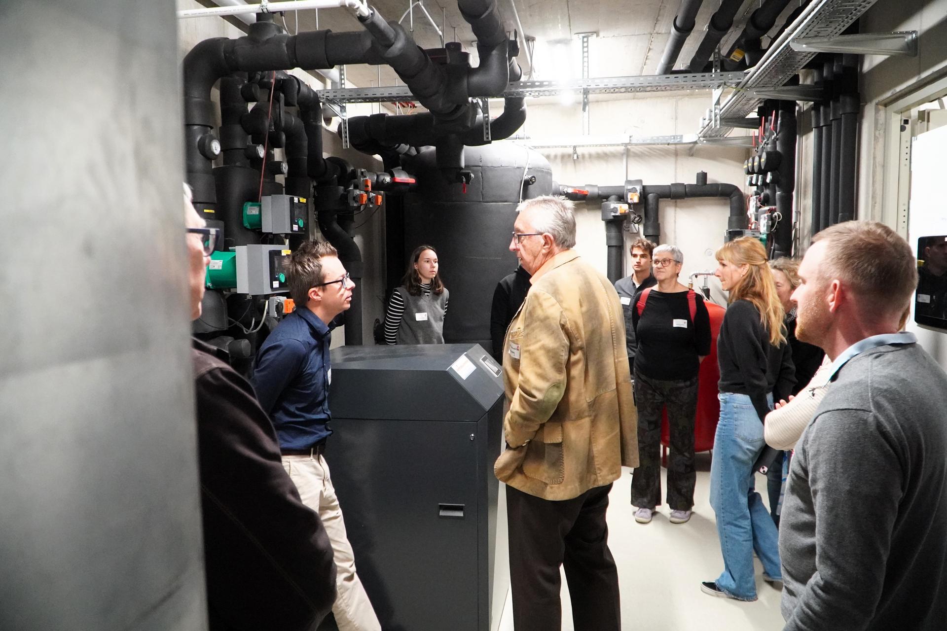 Im Technikraum wurde die Funktionsweise der Solewärmepumpe besprochen. Diese nutzt die konstante Temperatur des Erdreichs, für eine klimafreundliche Beheizung und Kühlung des Gebäudes mittels nachaltigem Kältemittel.