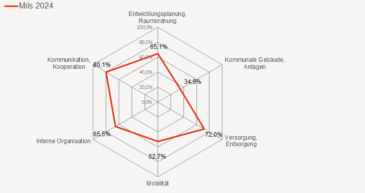 Die Gemeinde Mils ist 2017 dem e5-Programm für energieeffiziente Gemeinden beigetreten. Mit der bereits teilweisen Umstellung des gemeindeeigener Fuhrpark auf E-Fahrzeuge engagiert sich Mils unter anderem im Bereich Mobilität und ist mit der Einführung der Energiebuchhaltungssoftware EBO dabei ihre Verbräuche digital zu erfassen und dauerhaft sowie fortlaufend zu überwachen.