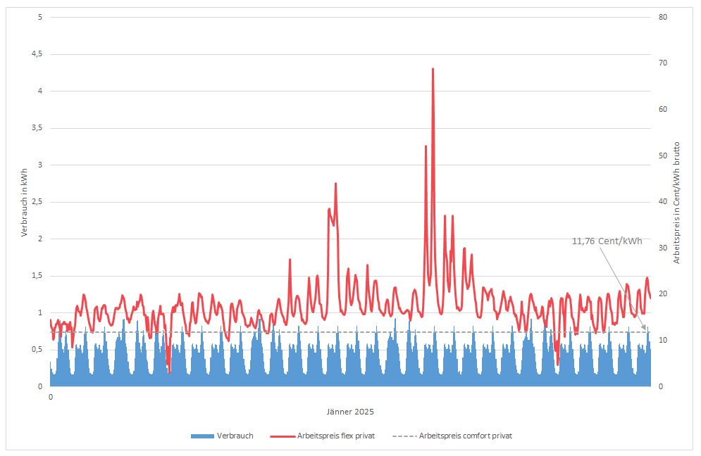Der Preis für den Monat Jänner 2025 für das Produkt flex privat wird auf Basis des Standardlastprofils H0 vom Jänner 2025 berechnet. Dabei werden die viertelstündlichen Verbräuche multipliziert mit dem viertelstündlichen Preis der EPEX Spot AT plus Aufschlag.