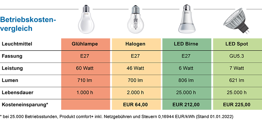 Herkömmliche Glühlampen „verheizen“ rund 95 % ihrer Gesamtleistung. Lediglich 5 % werden tatsächlich in sichtbares Licht umgewandelt. Die Alternative? LED. Nicht nur, dass die Lichtausbeute größer ist als bei herkömmlichen Glühlampen, sie verbrauchen etwa 90 % weniger Strom und haben eine bis zu 20-fache Lebensdauer!