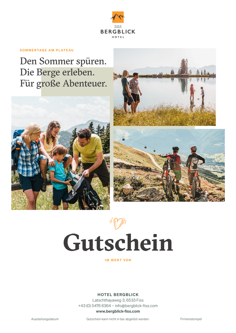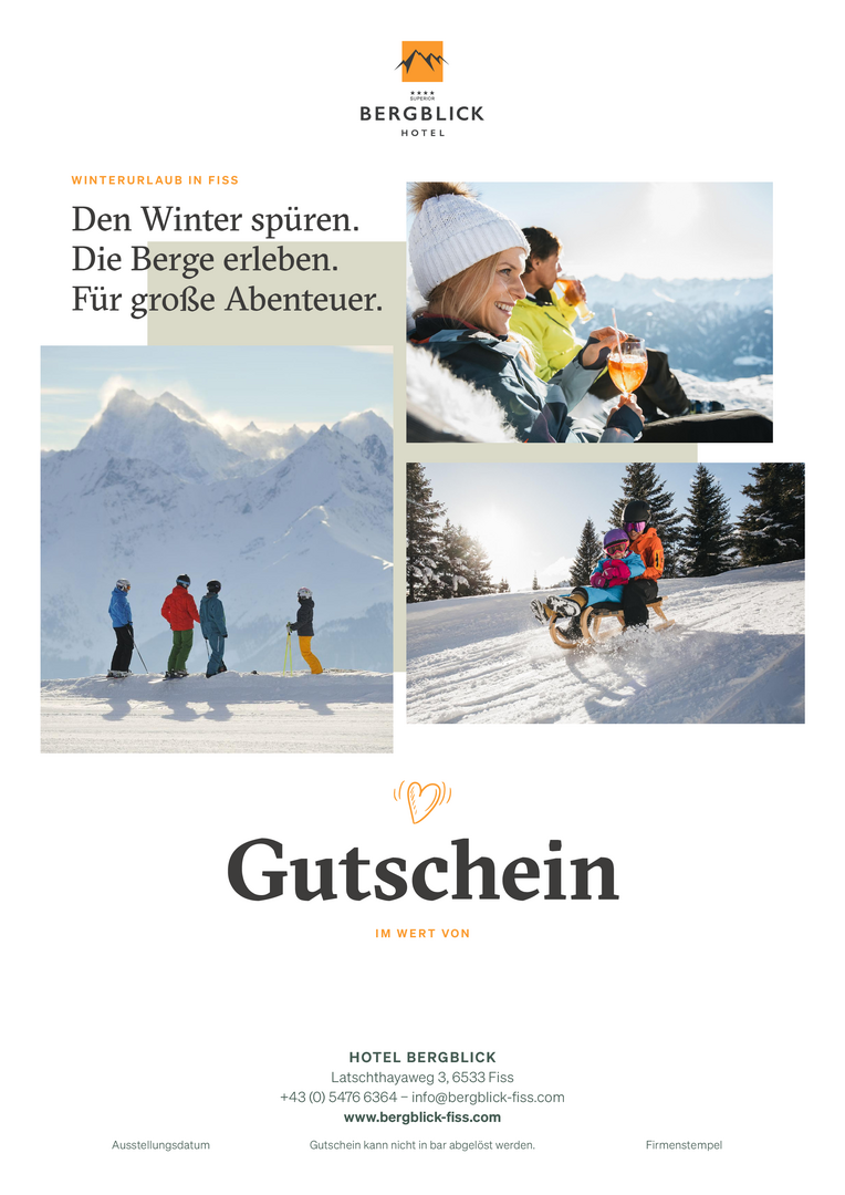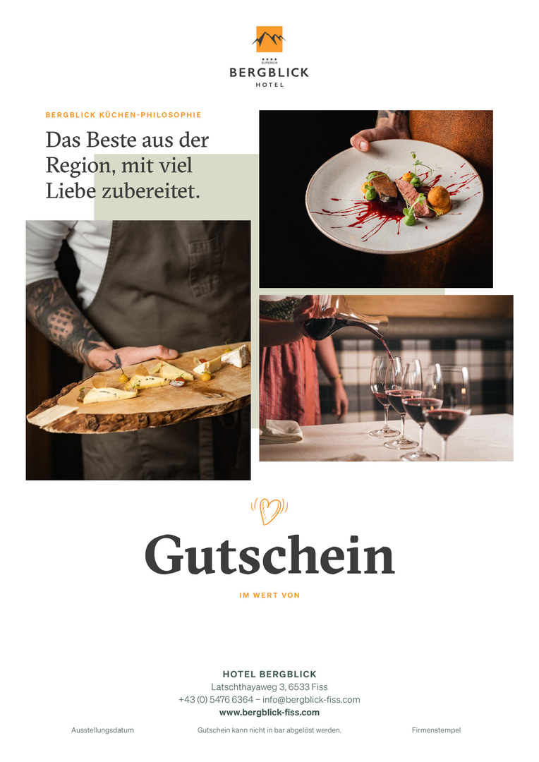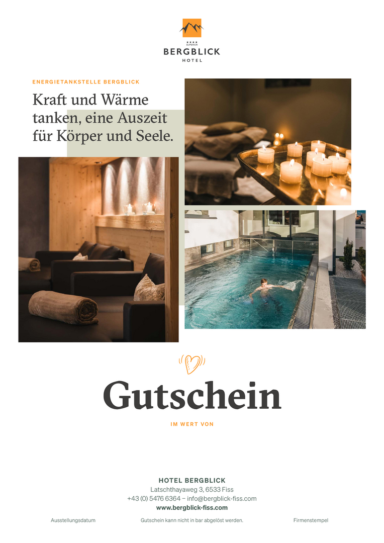 Eine Auszeit für Ihren liebsten Menschen, ein Dankeschön an die Mama oder wohlverdientes Verwöhnprogramm für die beste Freundin: Unsere Gutscheine für einen Urlaub im Hotel Bergblick sind ein kleines Stück Glück und machen garantiert Freude. Gerne stellen wir auch individuelle Gutscheine für Sie zusammen.