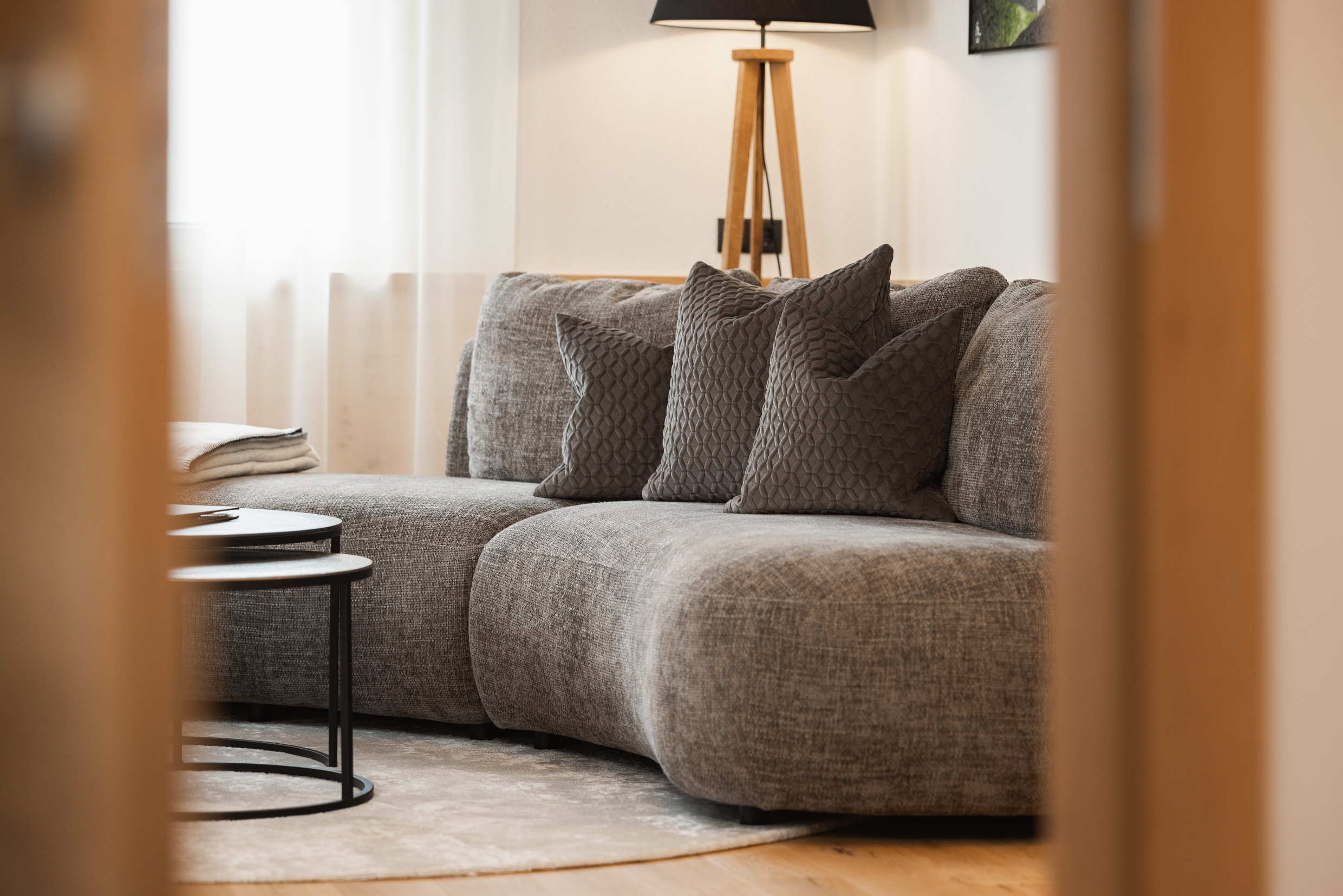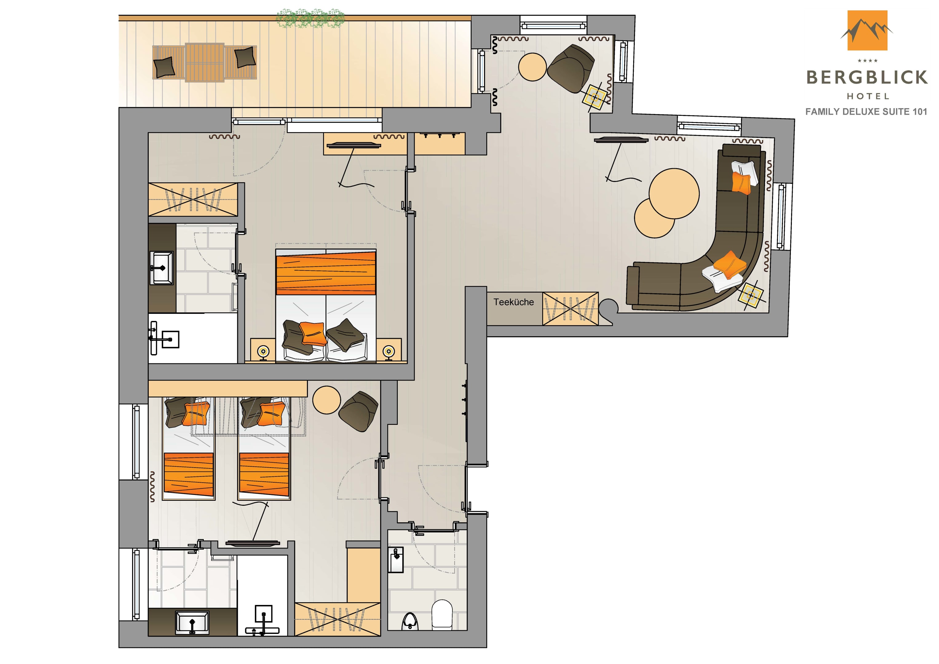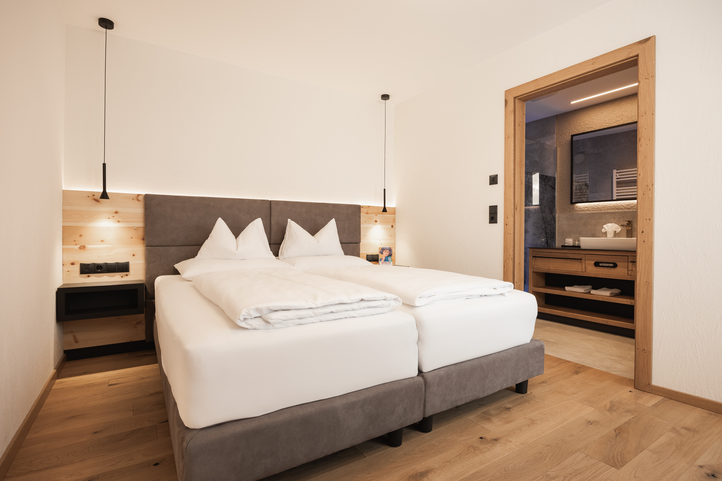 Unsere Family Deluxe Suite aus edlem Zirbenholz ist das perfekte Zuhause für die ganze Familie. Diese geräumige 3-Raum-Suite bietet zwei getrennte Schlafzimmer, jedes mit eigenem Badezimmer, sowie einen großzügigen Wohnbereich mit gemütlicher Sitzecke. Ein separates WC und eine Terrasse mit beeindruckendem Blick auf die umliegende Berglandschaft runden das Angebot ab. Die Schlafzimmer sind mit hochwertigen Boxspringbetten (1,80 m x 2,00 m) ausgestattet, wobei ein Zimmer zusätzlich über die Möglichkeit verfügt, die Betten zu trennen und ein weiteres Stockbett zu nutzen. Im Zimmer finden Sie außerdem