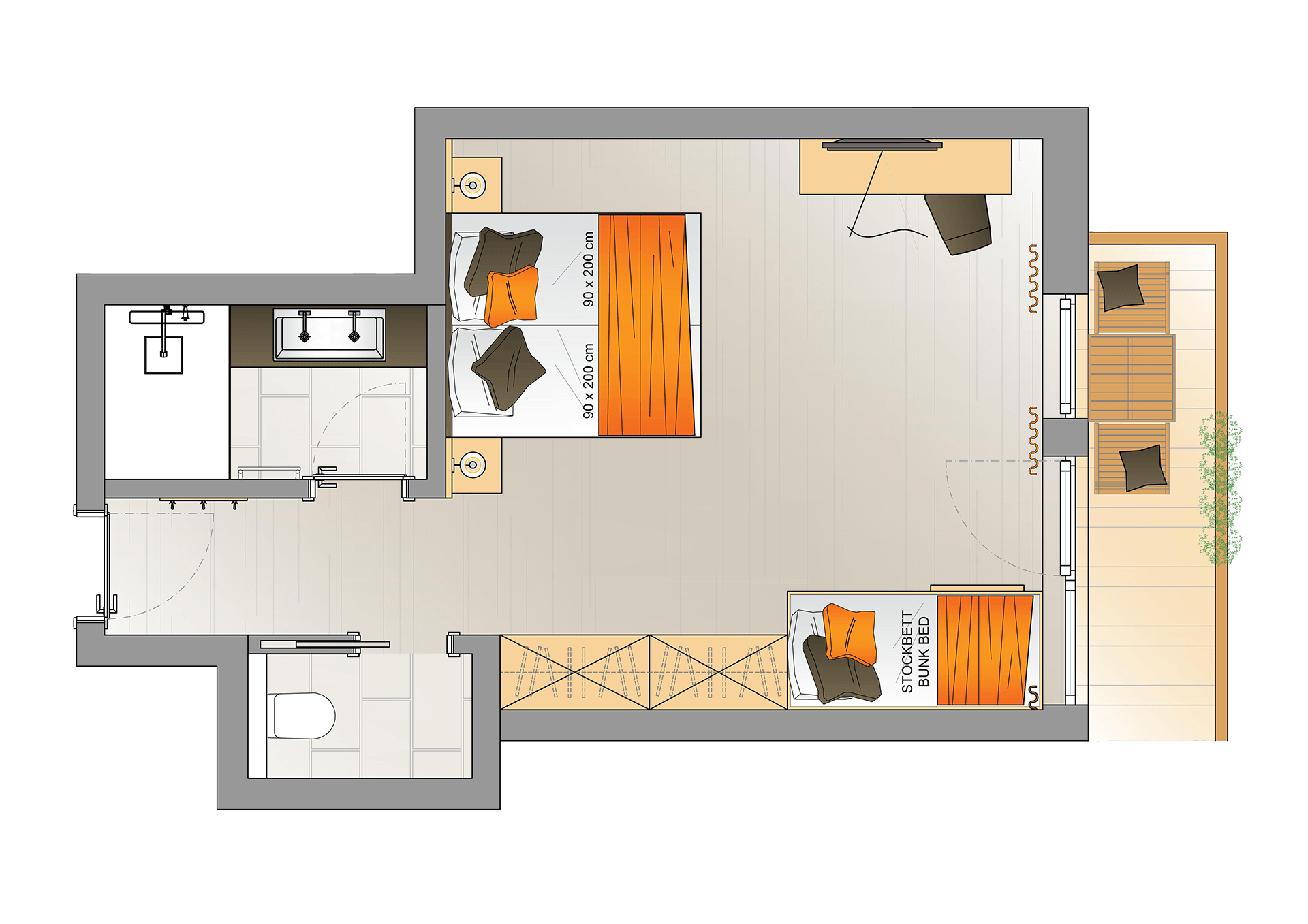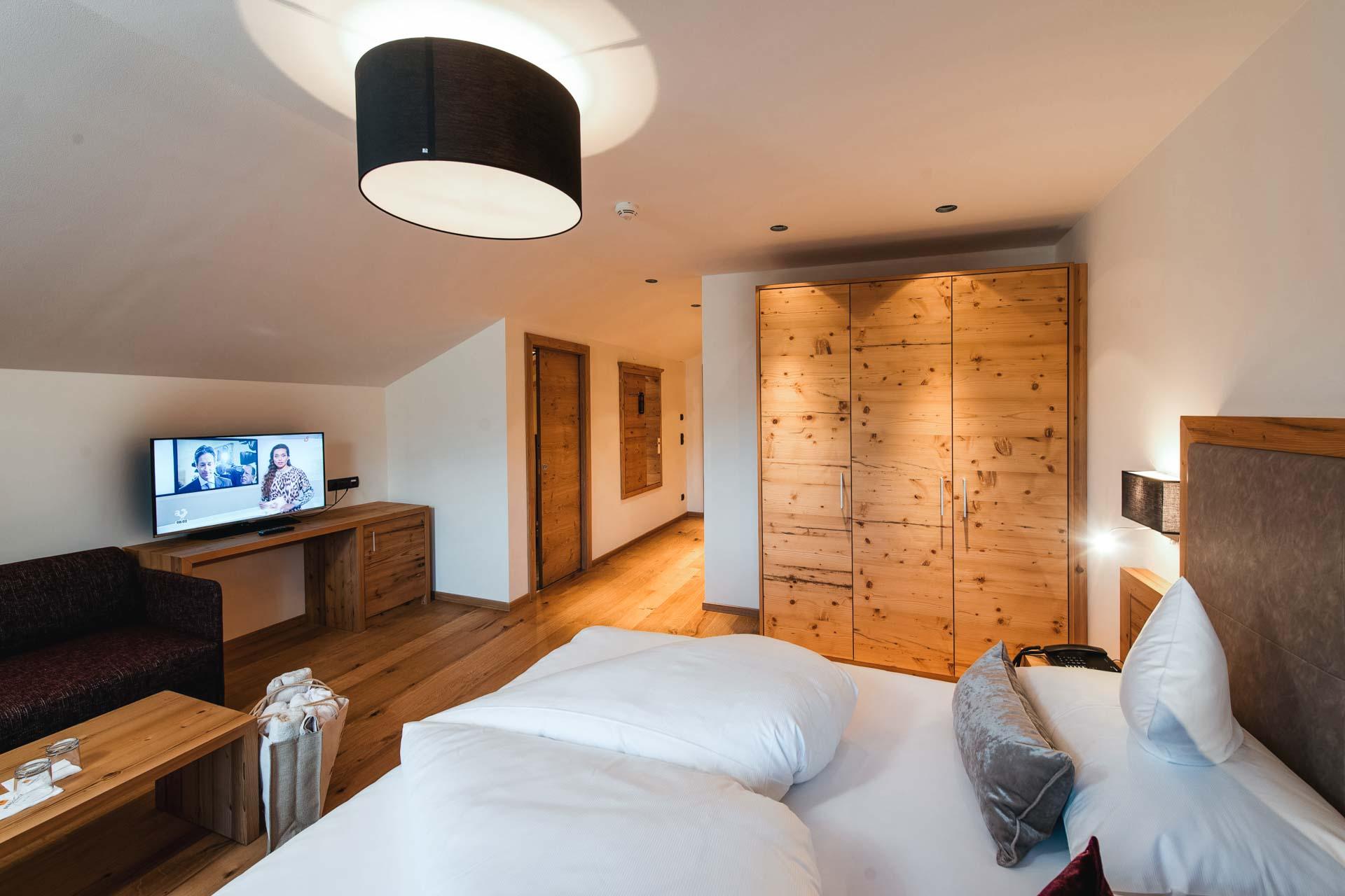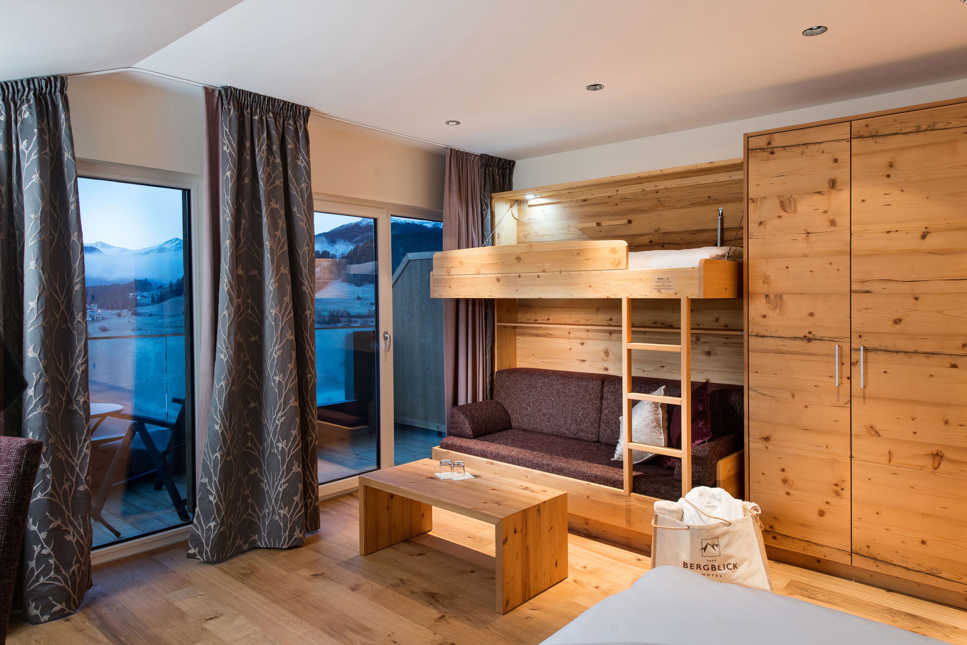 Diese Panorama Suite wird ihrem Namen mehr als gerecht: Sie genießen vom Fenster oder Balkon aus einen freien Blick über die gesamte Bergkette bis zur imposanten Karlspitze. Süße Träume garantieren das hochwertige Boxspringbett (1,80m x 2,00m) und das komfortable Schlafsofa, das auch als Stockbett für Kinder dient. Zusätzlich ist die Suite mit einem kleinen Schreibtisch, Flat-TV, Wi-Fi, Telefon und Safe ausgestattet. Das großzügige Badezimmer punktet mit: