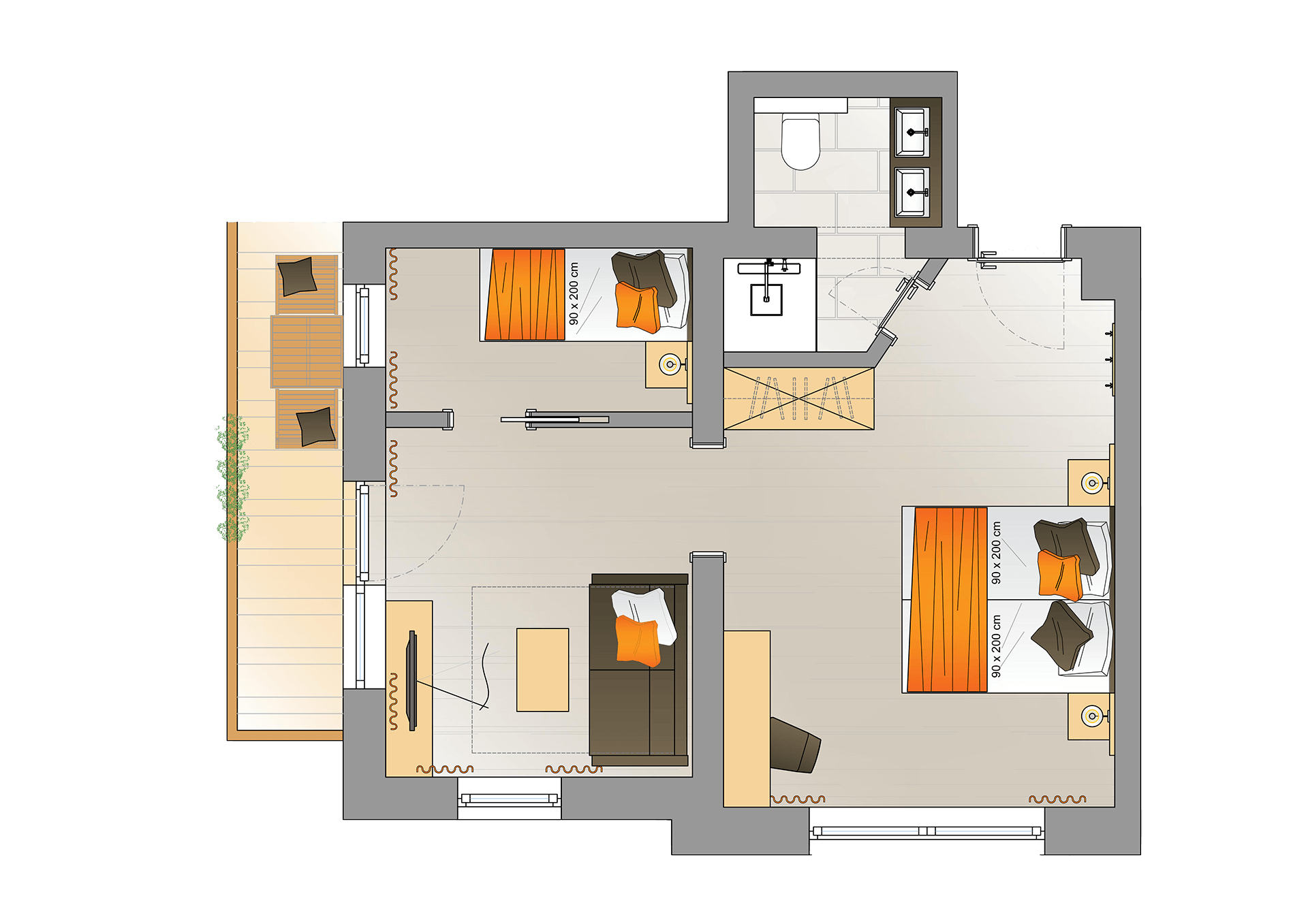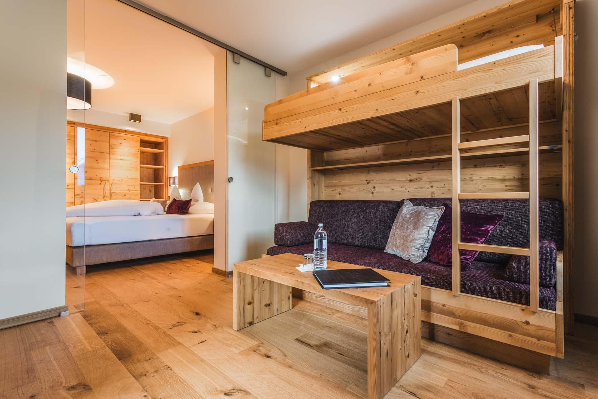 Ein (König)reich für Familien: In dieser großzügigen Suite fühlen sich Familien pudelwohl. Ein großes Boxspringbett (1,80m x 2,00m) für Mama und Papa und das Schlafsofa, zum Stockbett umfunktioniert, versprechen erholsamen Schlaf. Der Schlaf- und Wohnbereich kann durch eine Schiebetür getrennt werden. Zur Suite gehört außerdem ein Balkon, Flat-TV, Safe, Telefon und Wi-Fi. Das moderne Badezimmer bietet: